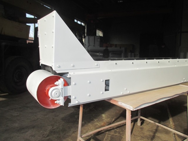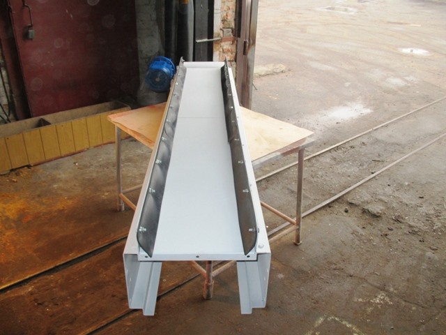 Рама желобчатого ленточного конвейера нашего производства собирается из типовых взаимозаменяемых секций (длиной 2 м каждая). Рабочая ветвь ленты опирается на желобчатые трехроликовые опоры, холостая ветвь - на прямые ролики. Загрузка материала на ленту производится через загрузочный короб, расположенный в нижней части конвейера, разгрузка осуществляется с барабана натяжной станции, расположенной в верхней части конвейера. Конвейер комплектуется мотор-редуктором, основные параметры которого определяются в зависимости от назначения конвейера.