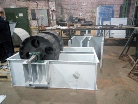 The traction part of the elevator is a rubberized belt (elevator belt), enveloping the upper (drive) and lower (tension) drums; the working part is the buckets attached to the belt by mounting bolts.